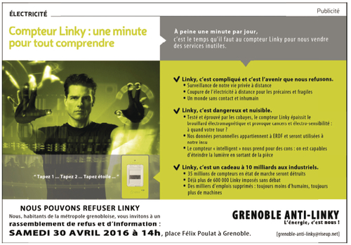 Affiche créée par le collectif Grenoble Anti-Linky à l'occasion du rassemblement du 30 avril 2016.