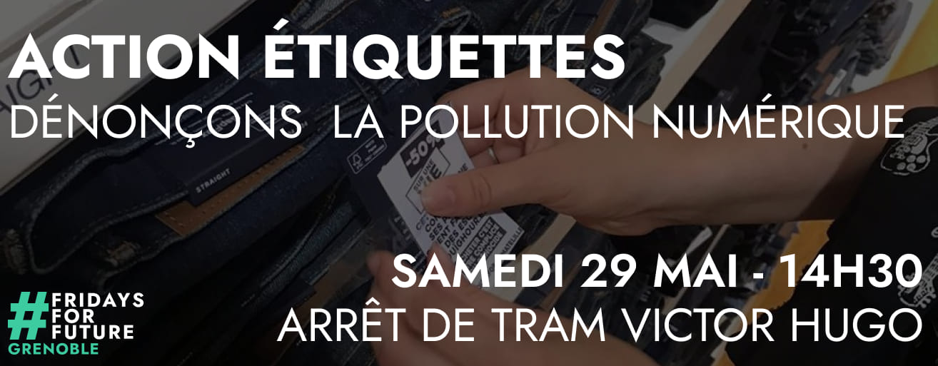 Le mouvement Fridays For Future Grenoble organise une action étiquettes sur la pollution numérique afin de dénoncer le coût écologique de la production des produits électroniques.