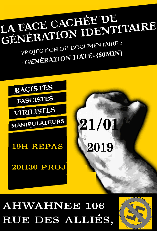 Ce lundi 21 Janvier, nous projetons un documentaire sur le mouvement Génération Identitaire. C’est une investigation en caméra cachée dans les coulisses du local de Génération Identitaire (Lille) la Citadelle.