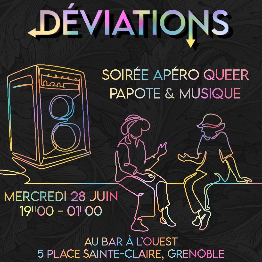 Dans le cadre de la quinzaine des fiertés, l'association Deviations (déviant es de genre, trans, trav, non binaire ou en questionnement) propose un apéro au Bar à l'ouest (place des Halles Ste Claire)à Grenoble mercredi 28 juin avec sélection musicale au choix du public..