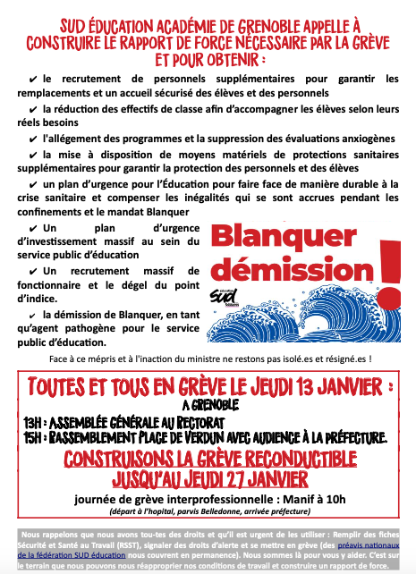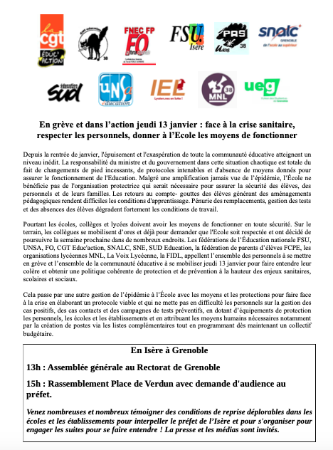 AG à 13h devant le Rectorat de Grenoble, puis rassemblement à 15h place Verdun.