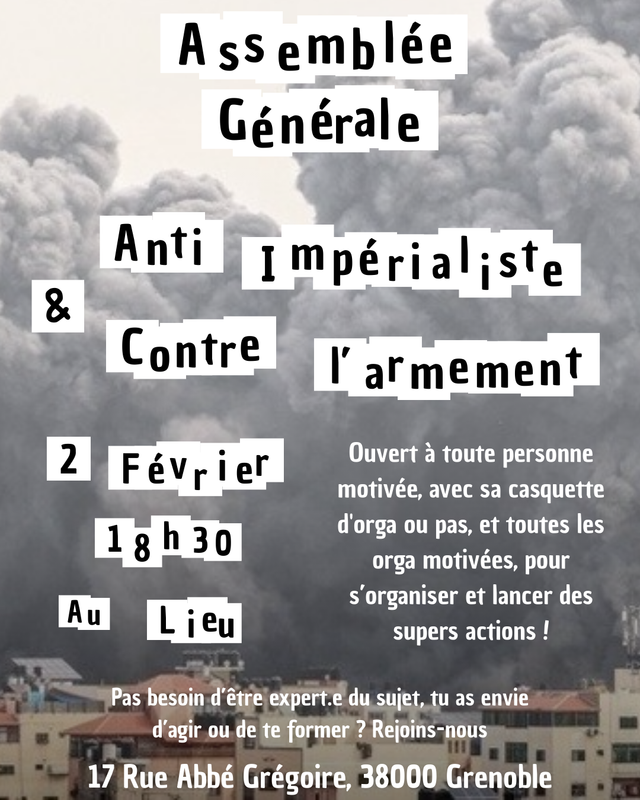 Alors voilà, l'idée de cette AG est de proposer à toute personne motivée et à toutes les organisations intéressées de venir se coordonner contre le militarisme et contre l'impérialisme, depuis Grenoble. Pas besoin d'être un expert du sujet ni d'avoir un bagage militant, tout est à construire ensemble !