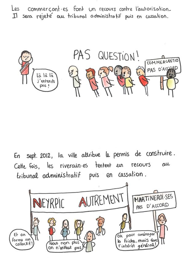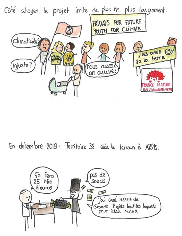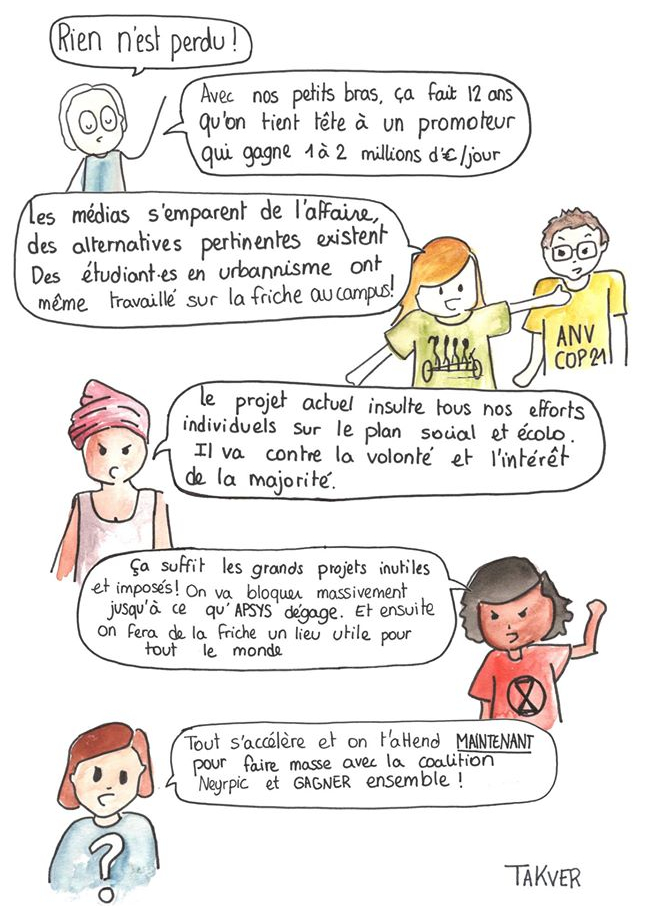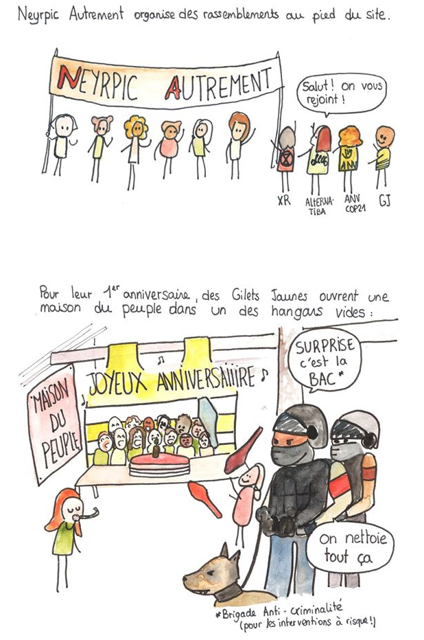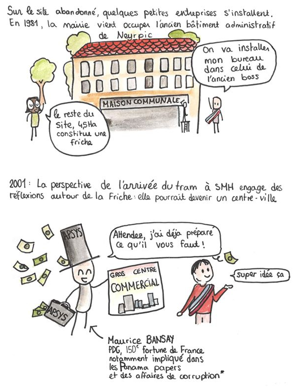 Pour comprendre la situation, la coalition Action Neyrpic, qui rassemble les collectifs et les personnes qui veulent libérer l’espace Neyrpic à Saint-Martin-d'Hères, diffuse la petite bande-dessinée suivante :