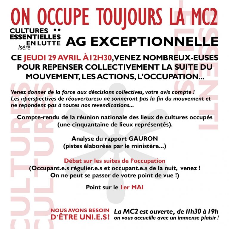 Depuis le 16 mars, le mouvement Cultures Essentielles en Lutte Isère occupe la MC2, dans la lignée du mouvement d'occupation de lieux culturels insufflée à l'Odéon à Paris, depuis le 4 mars.