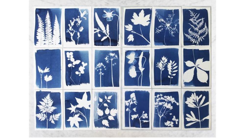 Venez apprendre à faire des cyanotypes à partir de ce qui pousse au jardin - et pourquoi en faire des cartes postales en y rajoutant (ou pas) coups de crayons et collages !