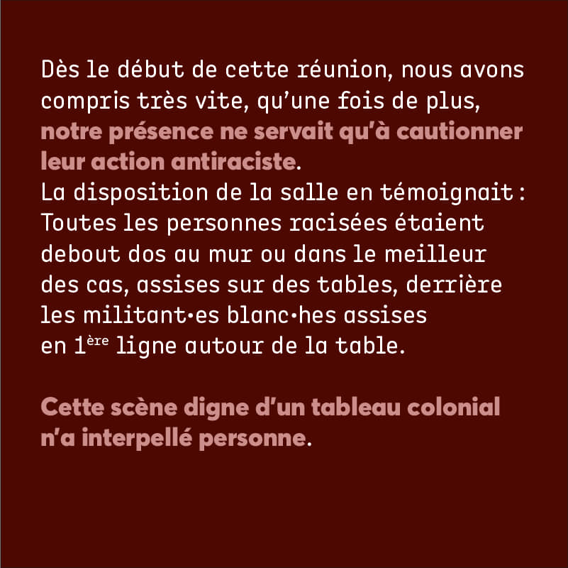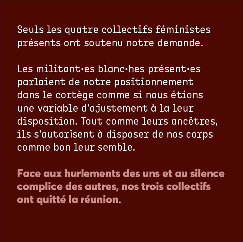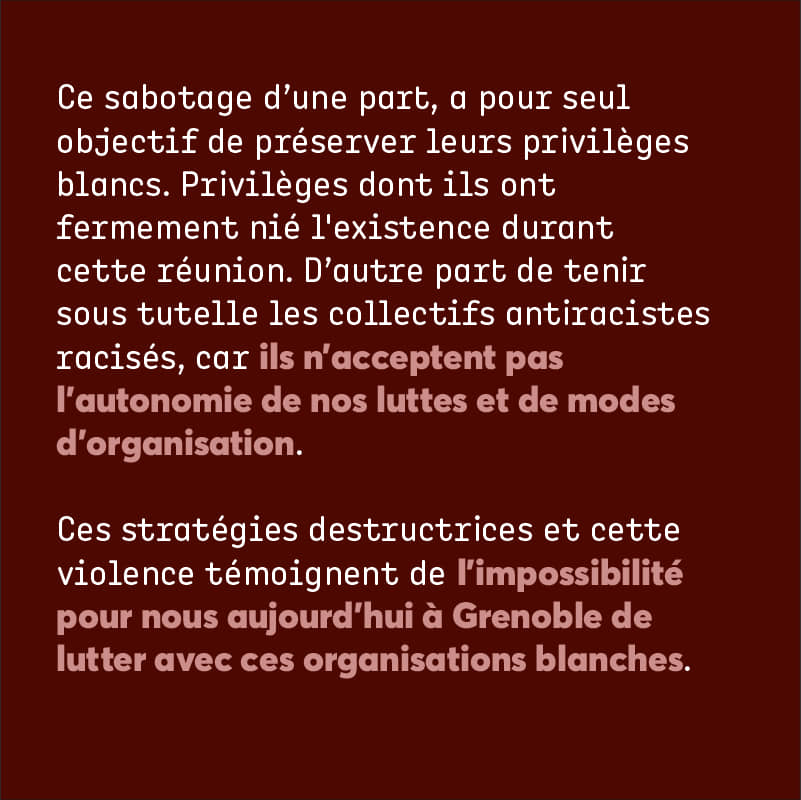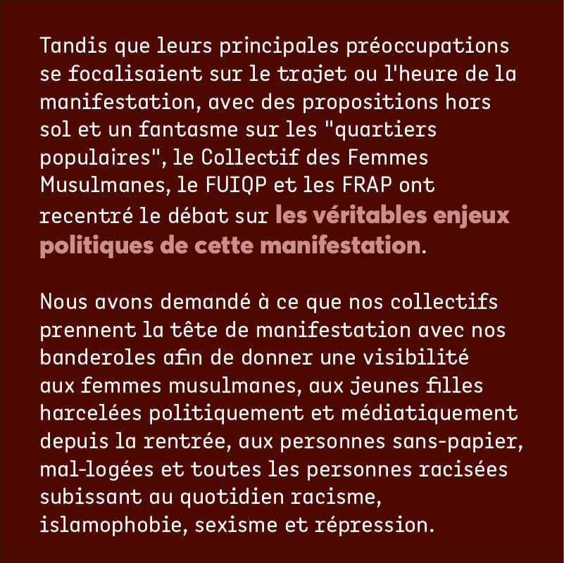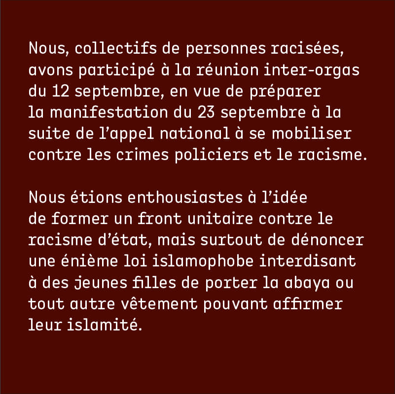 Pourquoi ? Que s'est-il passé lors de cette assemblée inter-orgas ? Voici les explications du Collectif des Femmes musulmanes de Grenoble, des Féministes racisèes Anti-patriarcat (FRAP38) et du FUIQP Grenoble :