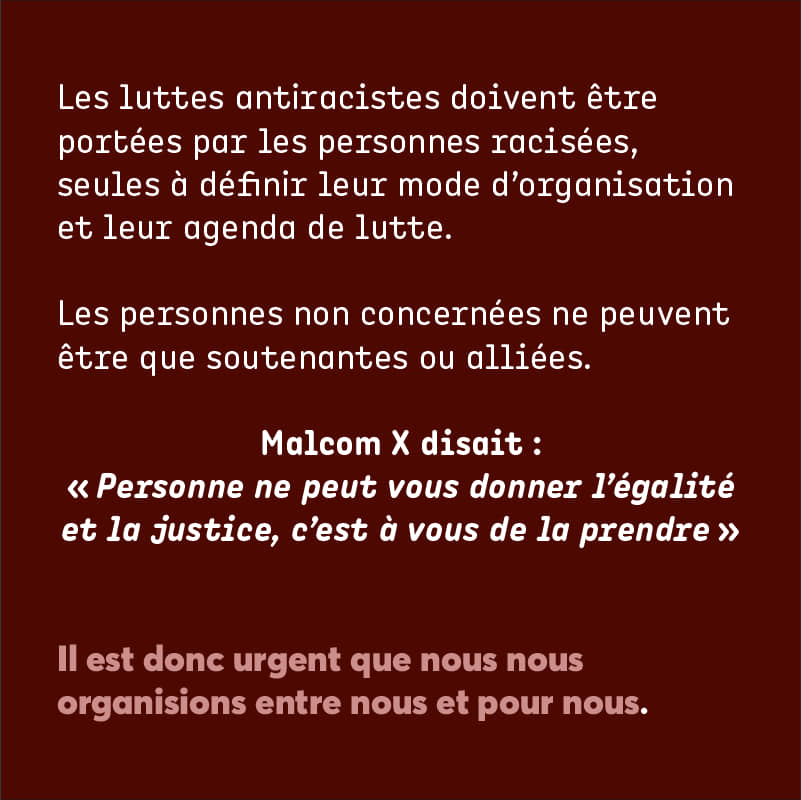 Le Collectif des Femmes musulmanes de Grenoble, les Féministes racisèes Anti-patriarcat (FRAP38) et le FUIQP Grenoble organisent une Assemblée Antiraciste exclusivement réservée aux personnes racisées, non-blanches.