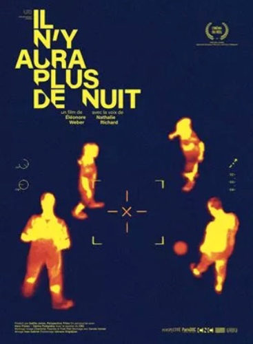 Projection du documentaire "Il n'y aura plus de nuit" (2020) d'Eléonore Weber, à partir d'images réelles de la guerre par hélicoptère. Les scènes se déroulent en pleine campagne, dans un paysage montagneux ou sur le toit d’un immeuble. Au fond du plan, on aperçoit de fines silhouettes, suffisamment distinctes malgré l’éloignement. Parfois, des hommes à l’allure fantomatique se mettent à fuir, on en déduit qu’ils se savent observés. Mais le plus souvent, ceux qui sont visés ignorent qu’ils sont visés, ils n’ont pas repéré d’où venait la menace, aussi ont-ils l’air complètement désorienté.