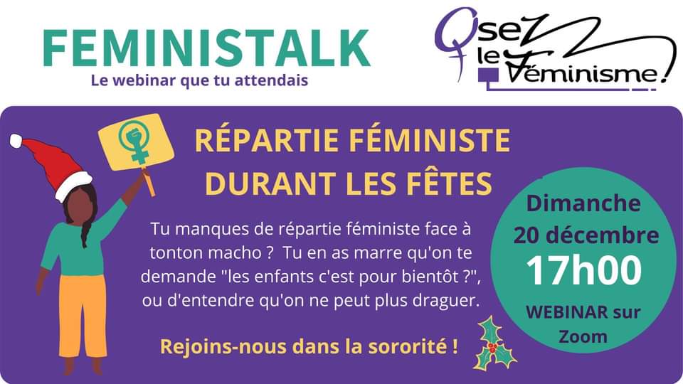 Pendant les fêtes de fin d'année, au milieu des cadeaux, des bons repas et des retrouvailles en famille, que faire face auxs commentaires sexistes à deux balles tout au long du diner ?Entre ton oncle réac ("Depuis #MeToo, on ne peut plus rien dire/ on ne peut plus draguer! ") et ta cousine en panique (pourquoi tu offres un vélo rose à mon fils ??), on finit avec un mal de crâne bien patriarcal...