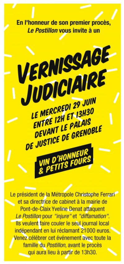 Le journal Le Postillon invite le tout-Grenoble à un « vernissage judiciaire » à l’occasion de son premier procès. Ça se passe le mercredi 29 juin, entre midi et 13h30, devant le palais de Justice. Il y aura des nappes blanches, du vin d’honneur et des petits fours. Venez comme vous êtes !