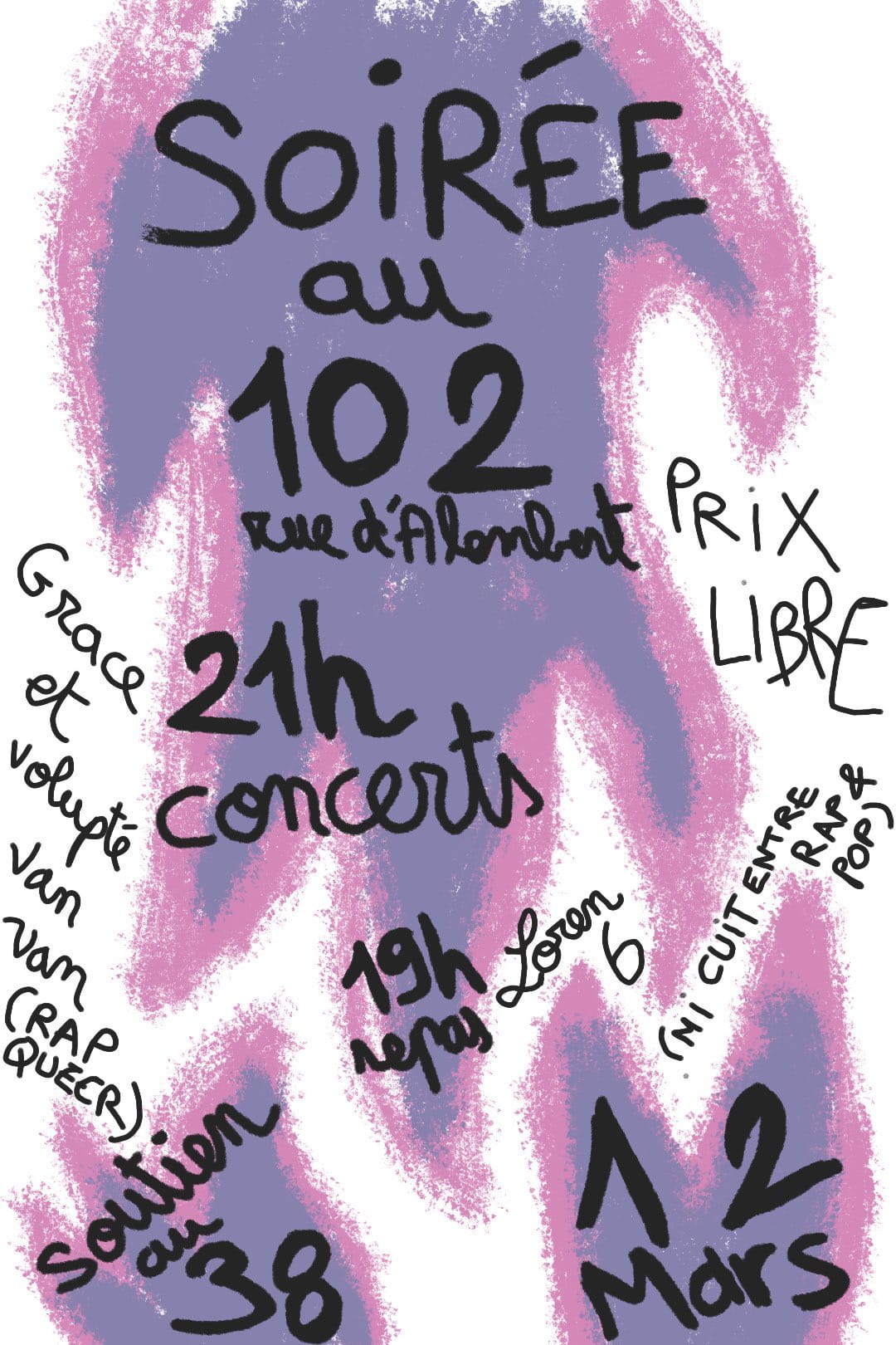 Soirée de soutien pour le 38 au 102 rue d’alembert le 12 mars ! Au programme cantine à prix libre à 19h, stands de merch du 38 (affiches, tote bag, calendriers) et concerts de Grâce et volupté van van (rap queer : https://linktr.ee/gracevoluptevanvan et Loren 6 (mi cuit entre rap et pop : https://linktr.ee/loren_6 Tout ça en soutien au centre social Tchoukar 38, dans le but de pouvoir faire les travaux nécessaires à la réouverture du lieu ! 🔥 Tu peux aussi soutenir le 38 en participant à la campagne de dons ici : https://www.helloasso.com/associations/les-amies-du-38/collectes/le-38-fait-peau-neuve-dons-pour-le-chantier Bar sur place. 19h ouverture des portes et cantine vegan 21h concerts 23h fin