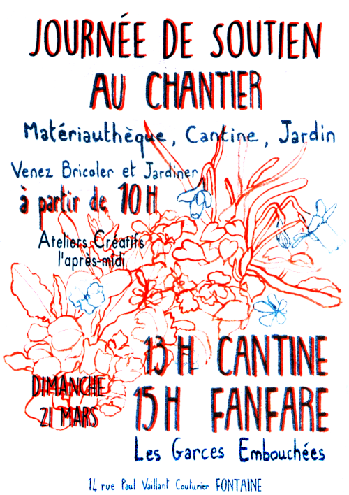 * Journée de soutien, le dimanche 21 mars de 10h à 17h au Chantier (14 rue Paul Vaillant-Couturier à Fontaine): venez découvrir le lieu et les activités qui font vivre le quartier (jardinage, bricolage, cantine, ateliers créatifs, ...).