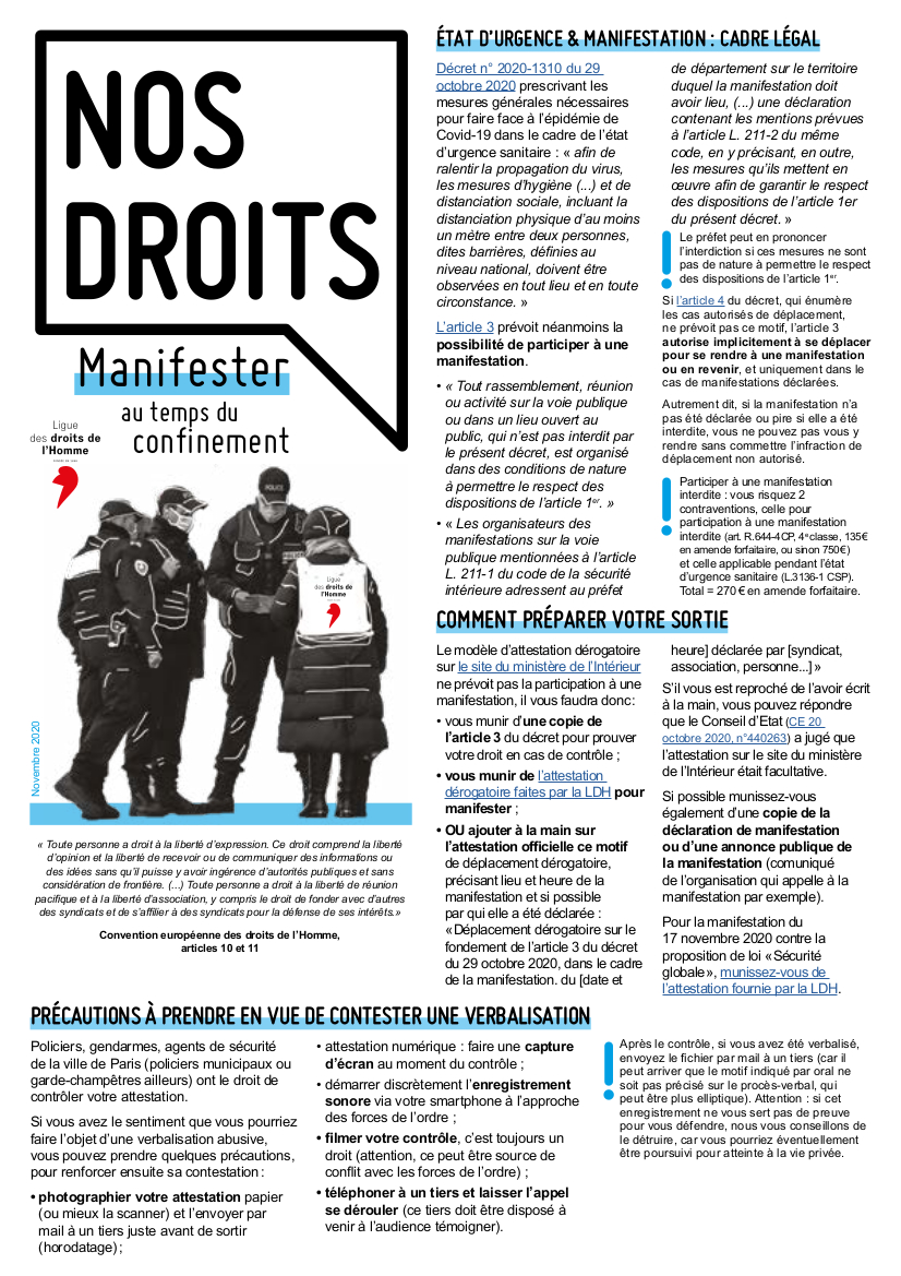 Voici un topo de la Ligue des Droits de l'Homme sur le droit de manifester pendant le confinement