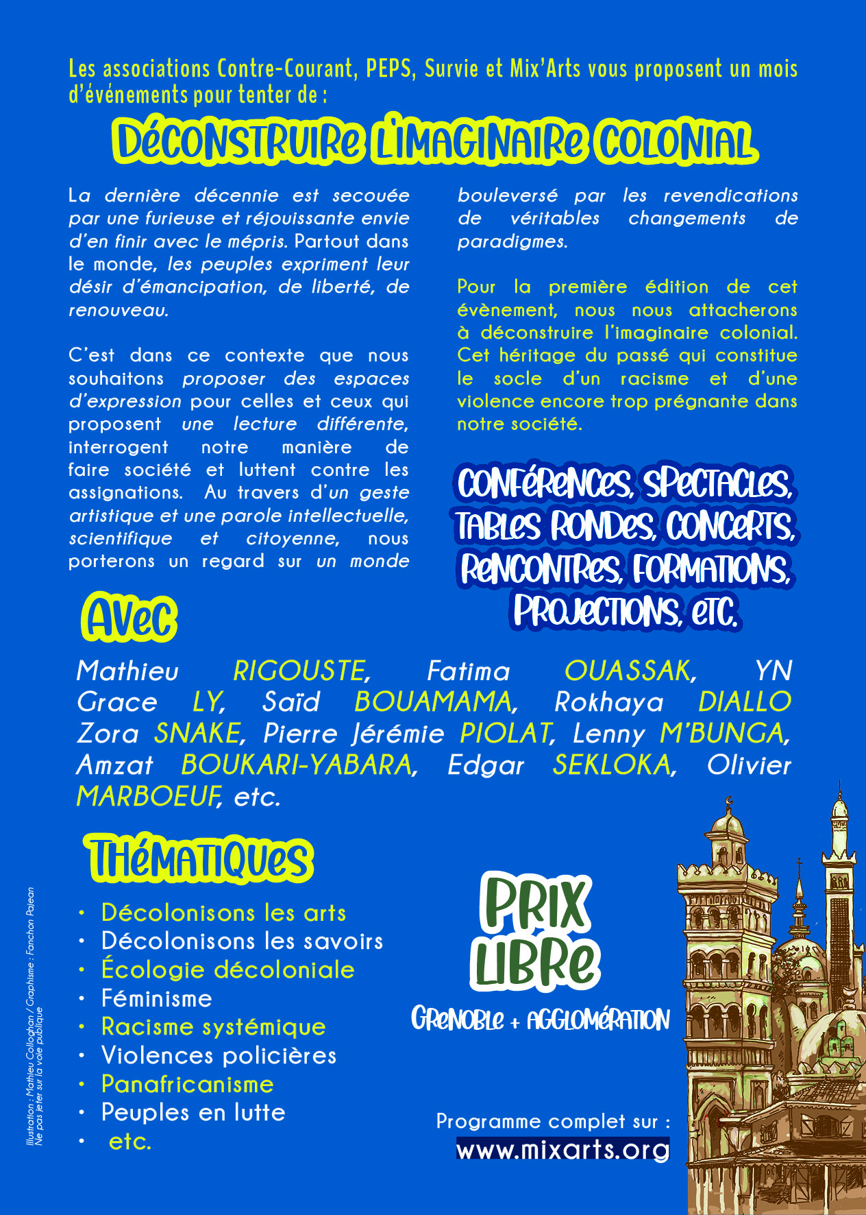 Contre Courant (association étudiante de Sciences Politiques), Mix’Arts (association culturelle et d’éducation populaire), PEPS (mouvement politique et d’éducation populaire d’écologie sociale et populaire) et Survie (association de lutte contre la françafrique) s’associent pour proposer un mois d’événements à prix libre, à Grenoble et dans l’agglomération, pour tenter, ensemble, de déconstruire l’imaginaire colonial.