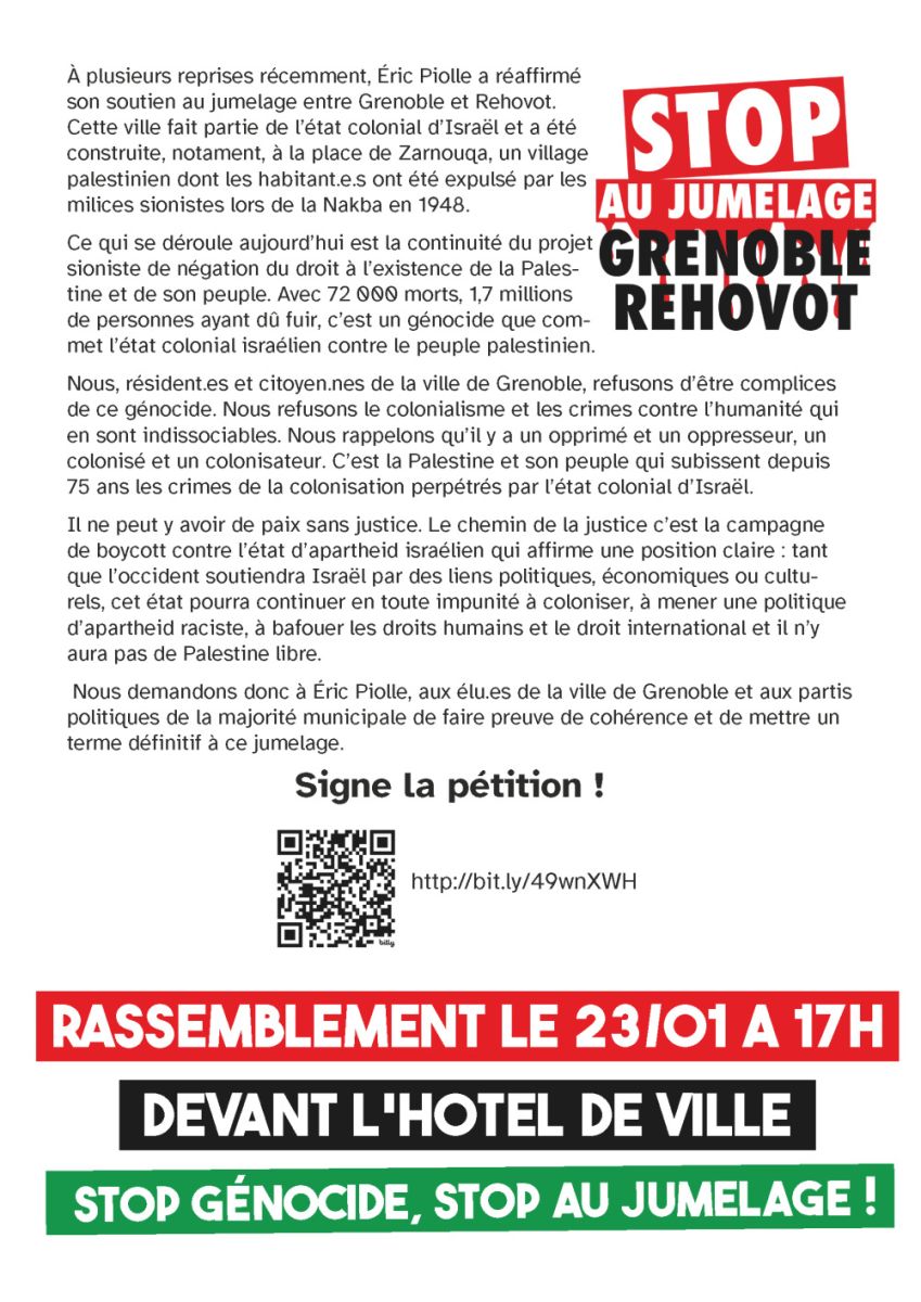 "Rassemblement contre le jumelage de Grenoble avec Rehovot. Rehovot a été construite sur Zarnouka, village palestinien dont les habitant.e.s ont été expulsé.e.s par les milices sionistes lors de la Nakba en 1948. Ce jumelage, réaffirmé plusieurs fois en plein génocide, légitime l'Etat colonial qu'est Israël. Nous exigeons sa rupture officielle et nous ne lâcherons pas !"