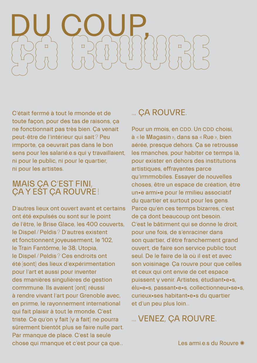 Artistes, étudiant.e.s, élue.e.s, passant.e.s, collectionneur.se.s, curieux.se.s, habitant.e.s du quartier et d’un peu plus loin ... Venez, ça rouvre.