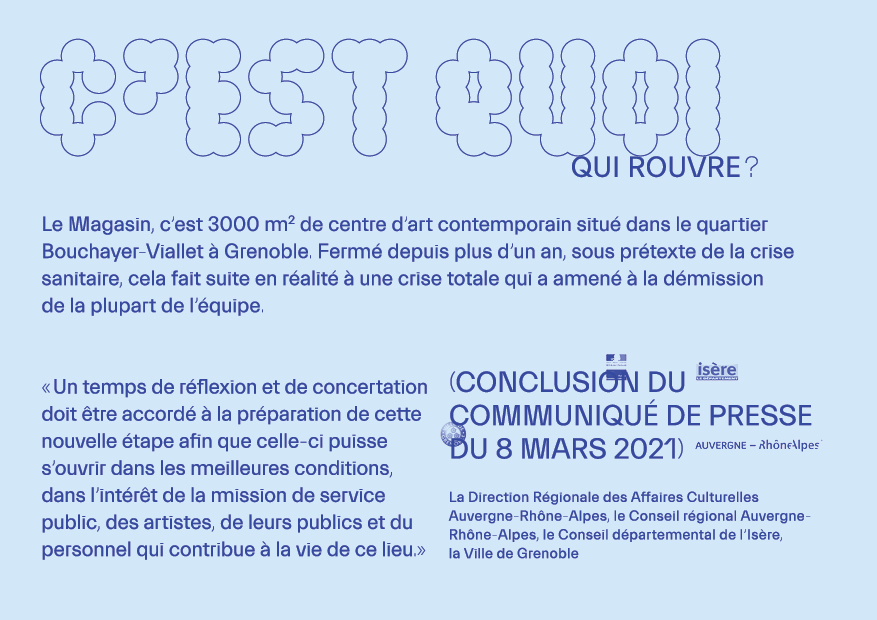 Depuis le 17 avril, un regroupement d'artistes et d'habitant.e.s du quartier Berriat-Saint Bruno tente de "réouvrir" le centre d'art "Le Magasin des Horizons" (8 Esplanade Andry Farcy à Grenoble) pour y proposer une programmation et des discussions sur l'avenir de ce lieu.
