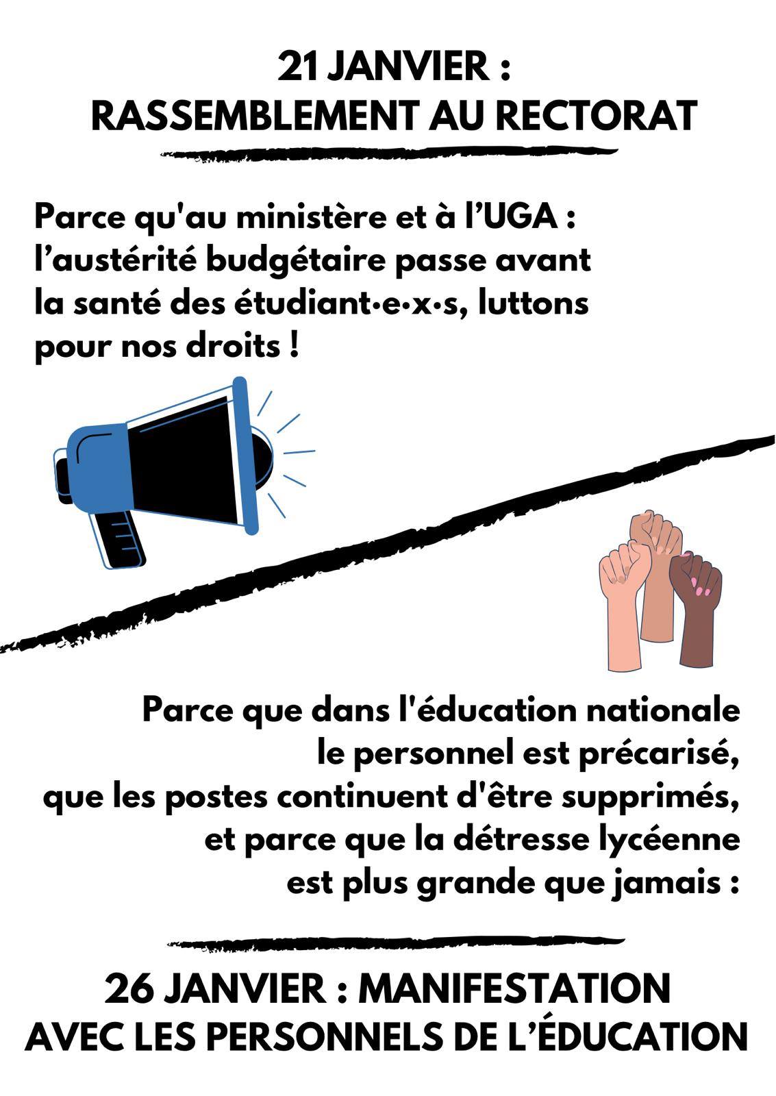 Nous appelons l’ensemble des étudiant·e·x·s et lycéen·ne·s à se rassembler devant le rectorat le 21 janvier à midi puis à manifester le 26 janvier aux côtés des personnels de l’éducation."