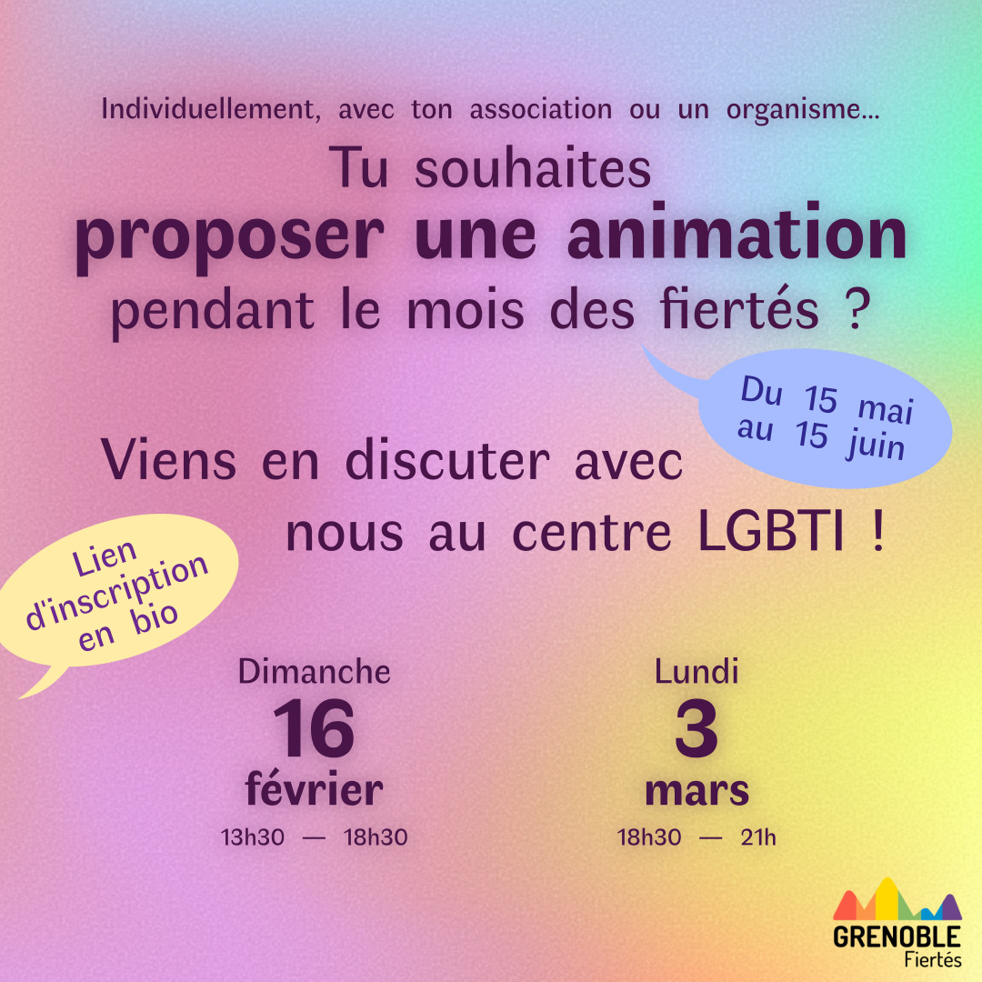 Viens rencontrer l’association Grenoble fiertés qui organise le mois des fiertés et la marche des fiertés dimanche 16 février entre 13h30 et 18h30 et/ou lundi 3 mars entre 18h30 et 21h au centre LGBTI 8 rue Sergent Bobillot à Grenoble.