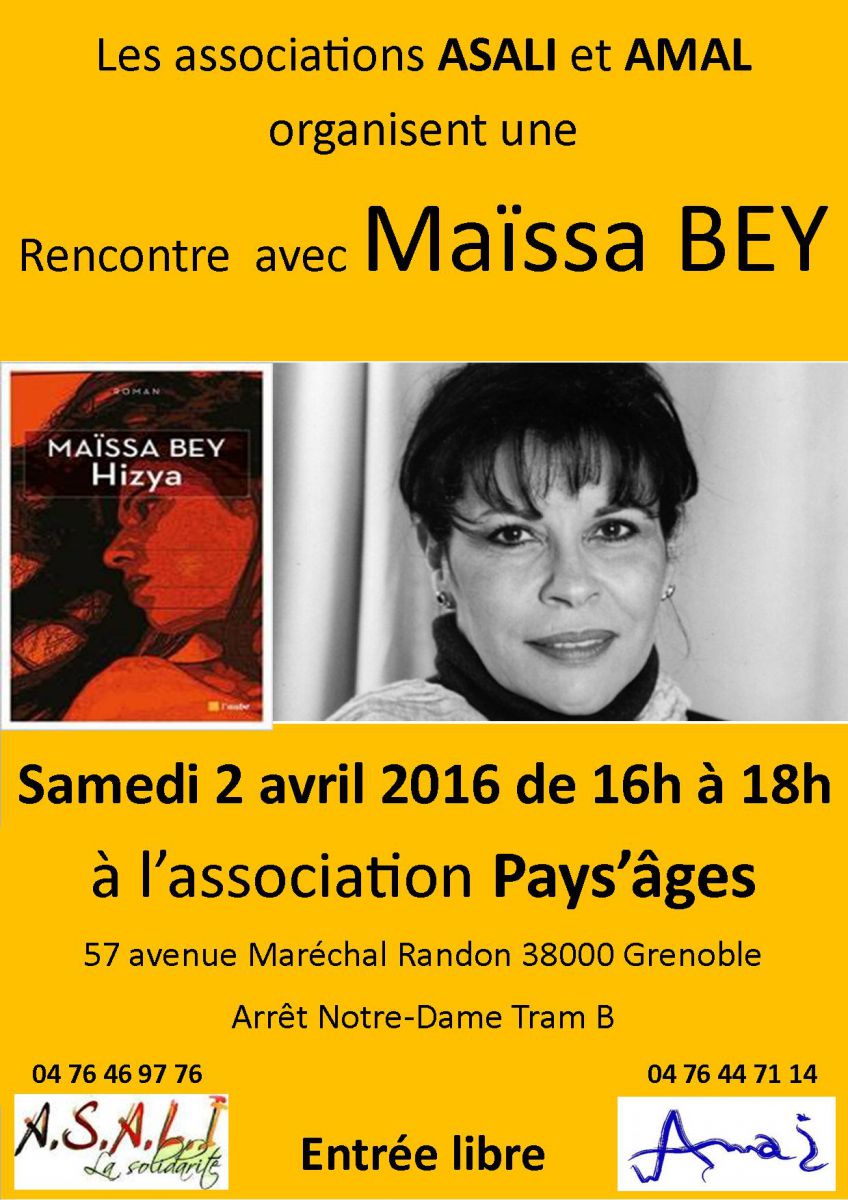 Notre association ASALI a le plaisir de recevoir l'écrivaine Maïssa Bey en partenariat avec les bibliothèques de Grenoble et l'association AMAL dans le cadre du "Printemps du Livre", le samedi 2 avril 2016 de 16h à 18h dans les locaux de l'association Pays'âges situés au 57 avenue du Maréchal Randon, juste en face du musée. Son écriture exprime ses révoltes et sa lutte contre le désespoir.