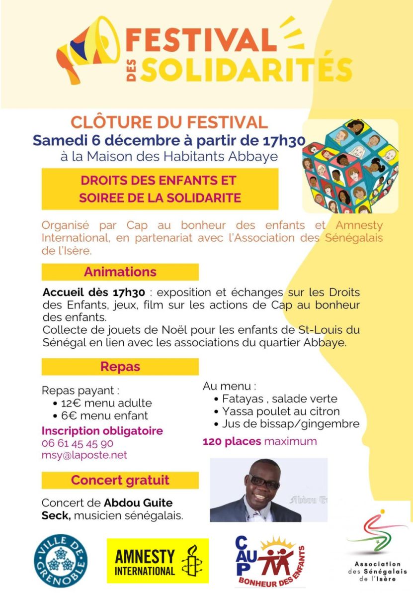 Soirée de clôture du Festival des Solidarités de Grenoble, organisée par Cap au Bonheur des Enfants et Amnesty International, en partenariat avec l'Association des Sénégalais de l'Isère