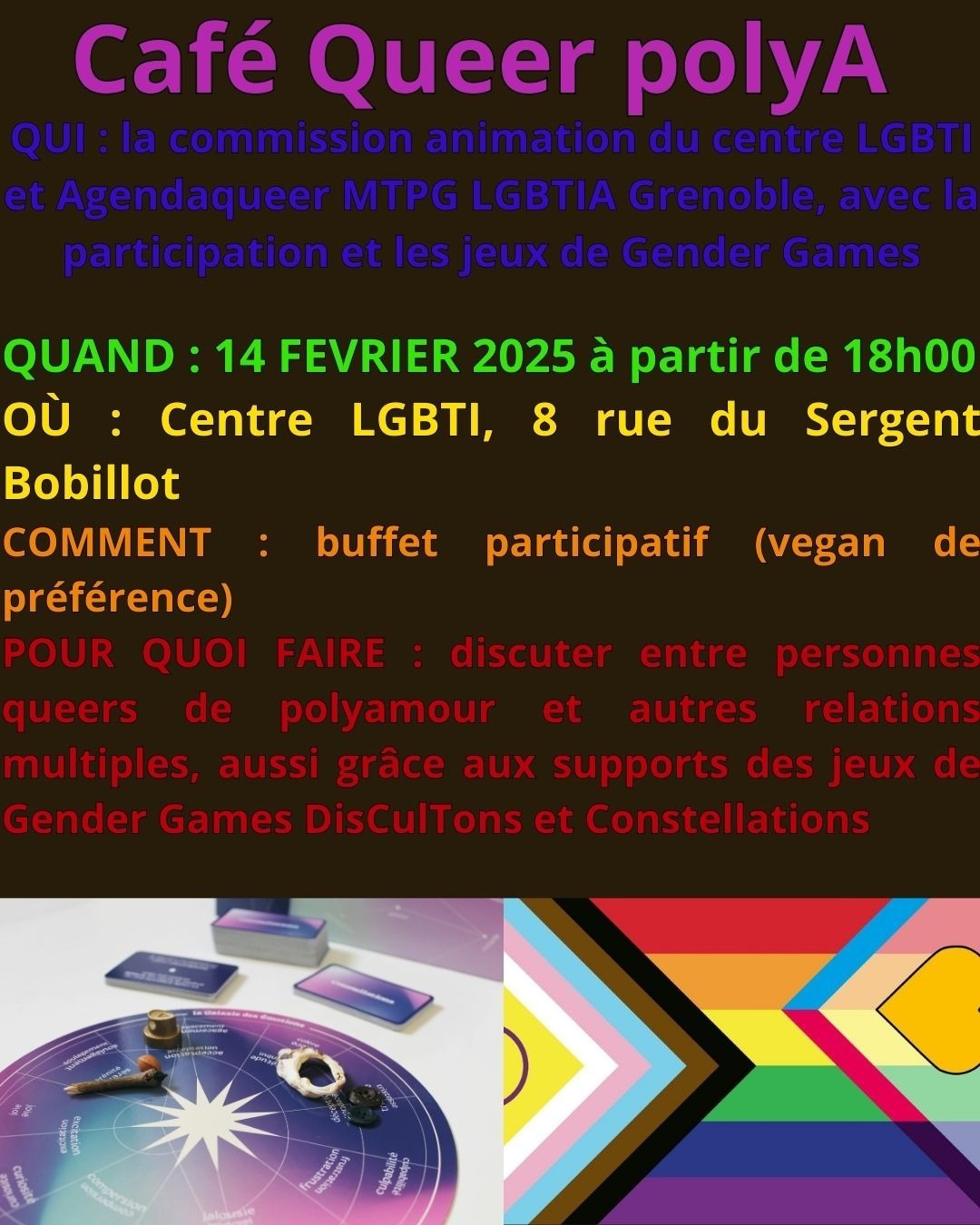 Vendredi 14 février 2025 viens au Centre LGBTI de Grenoble discuter polyamour entre queers avec les jeux "constellation" et "dis cul tons" de la maison d'édition play gender games entre 18h30 et 22h !