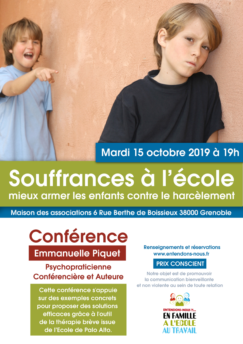 L'association Entendons-nous à le plaisir de recevoir Emmanuelle Piquet sur Grenoble. Venez découvrir des outils pour aider les enfants à se protéger du harcélement.