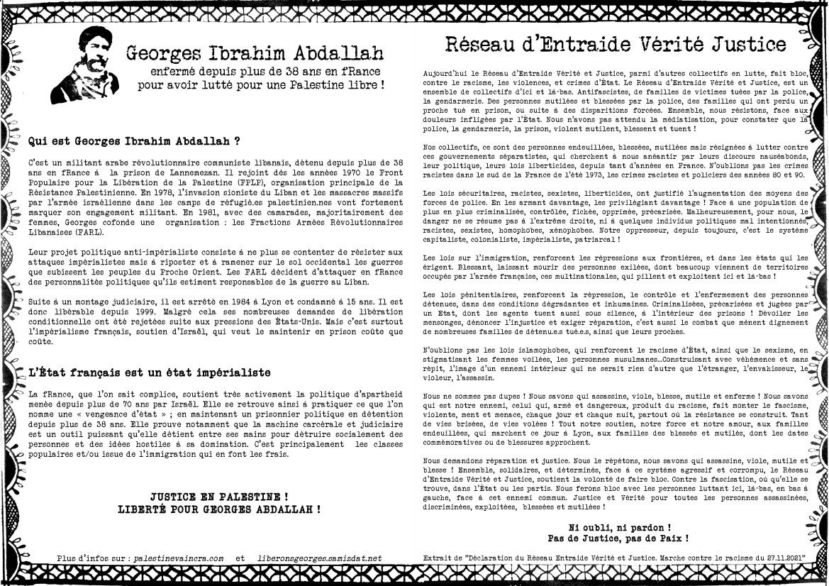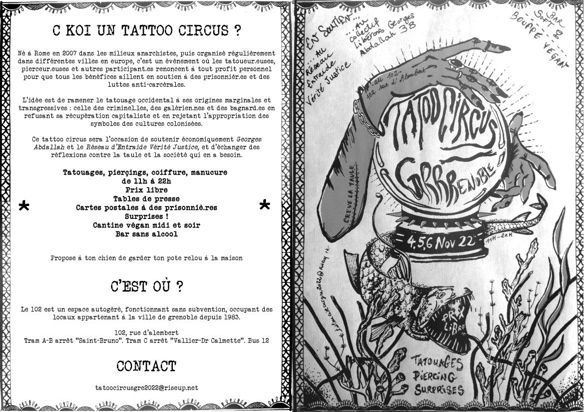 Tatoo Circus !!! Le 4,5,6 novembre au 102 rue d’Alembert. En soutien à Georges Ibrahim Abdallah et au Réseau Entraide Vérité et Justice ! 11h00 - 22h00 Tatoo Circus !!! Le 4,5,6 novembre au 102 rue d’Alembert. En soutien à Georges Ibrahim Abdallah et au Réseau Entraide Vérité et Justice ! 11h00 - 22h00 Tatoo Circus !!! Le 4,5,6 novembre au 102 rue d’Alembert. En soutien à Georges Ibrahim Abdallah et au Réseau Entraide Vérité et Justice ! 11h00 - 22h00