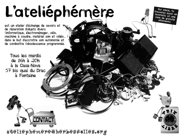 L’objectif de l’ateliéphémère est de lutter contre l’obsolescence programmée et le gaspillage en réparant toutes sortes d’objets et d’appareils électroménagers, audio, vidéo…