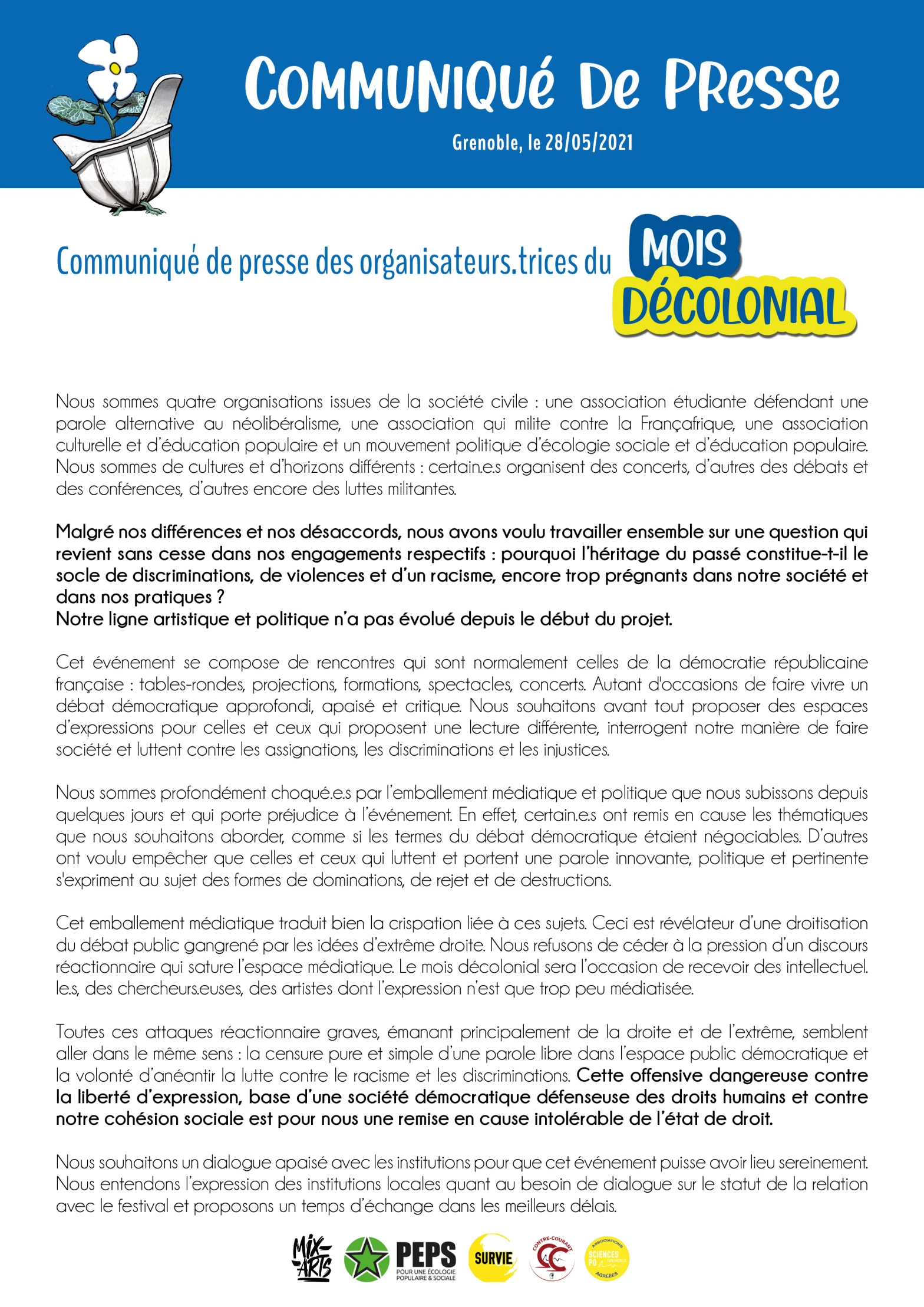Face à la polémique qui a éclaté en juin 2021 concernant l'organisation du mois décolonial à Grenoble, Les quatres structures organisatrice ont pris la parole.